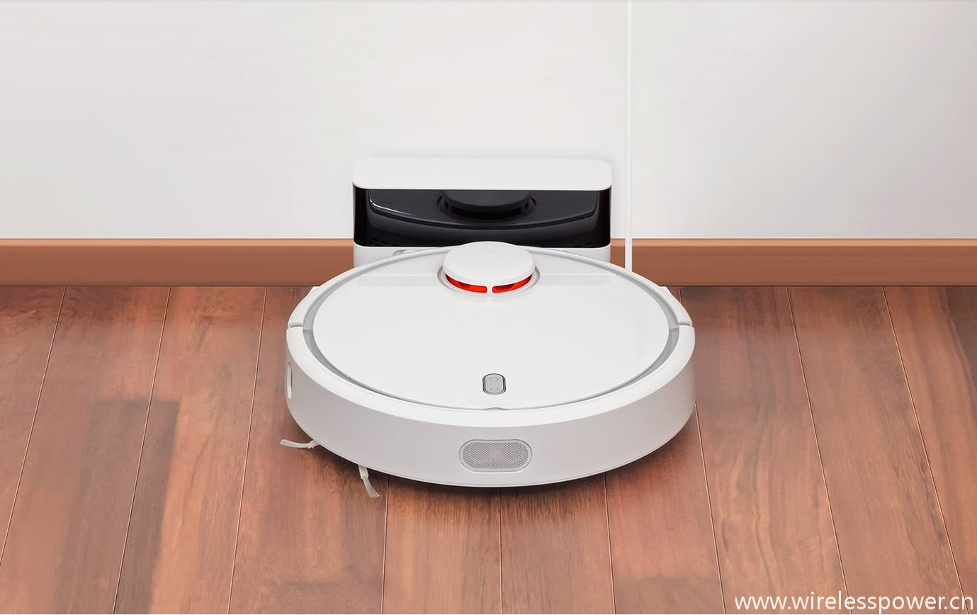 充电基座内集成无线充电发射端,机器人内集成无线充电接收端,机器人靠近基座时自动完成充电